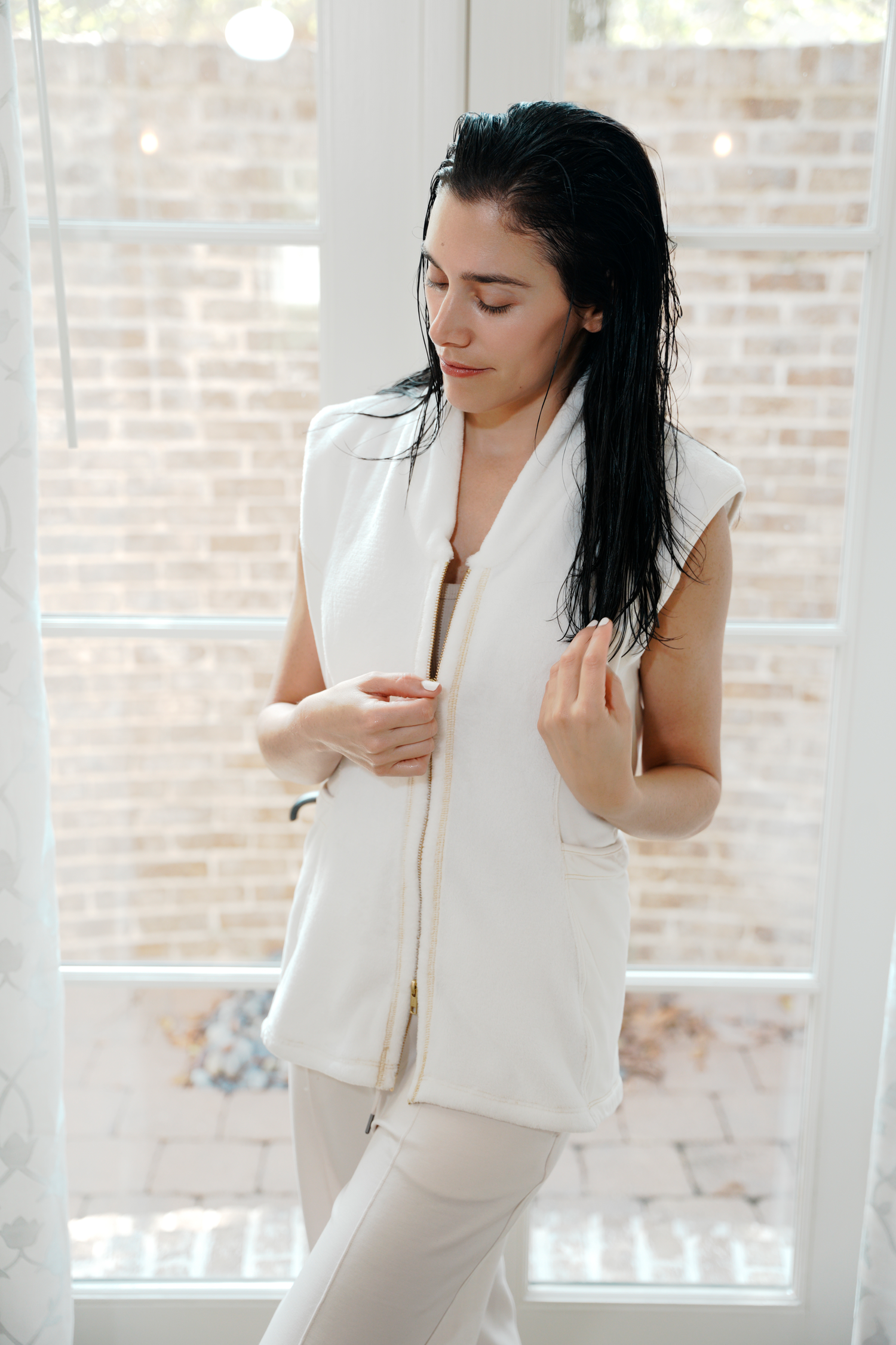 Efficiency without compromising style. A front zipper that streamlines makeup application and regulates body temperature. If someone comes to the door, you look dressed – not half naked.
